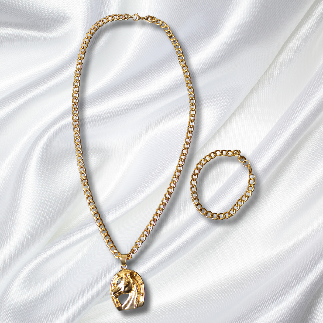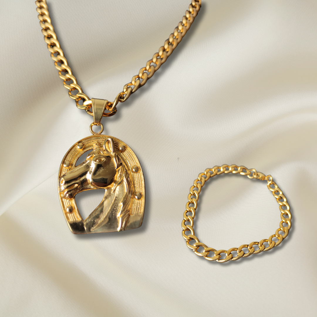 Luce el poderoso set Cadena Cubana + Pulsera + Dije Caballo Herradura en Cover Gold. Un combo que refleja fuerza, elegancia y buena fortuna. Material resistente, diseño exclusivo y duradero. ¡Envío gratis a toda Colombia y pago contra entrega!